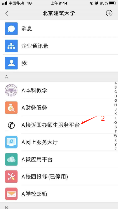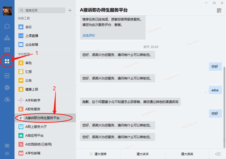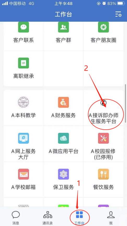 企业微信客户端中(手机APP和PC客户端均可)“工作台—A接诉即办师生服务平台”进行访问,如下图所示。