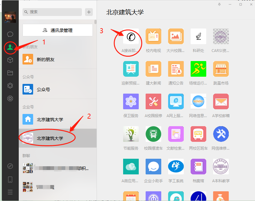 微信客户端中(手机APP和PC客户端均可)“通讯录—色tv(企业号)—A接诉即办师生服务平台”进行访问,如下图所示。