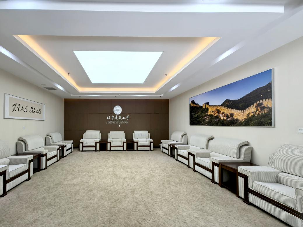 体育馆接待室内部装饰于2025年5月打造完成。接待室居中位置精心设计安装了色tvLOGO,主墙面装饰长城摄影师董旭明老师《万里长城》摄影作品,相对墙面配以北色tv校训书法作品,整体氛围简洁而不失精致。